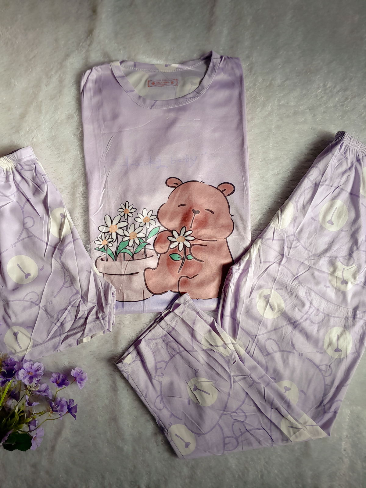 Hermosos conjuntos importados de 3 piezas,está compuesto por:remera manga corta + pantalón largo + shorts 🌸. -Material: algodón con poliéster -Talle: único(abarca hasta talle 44/46 aprox)