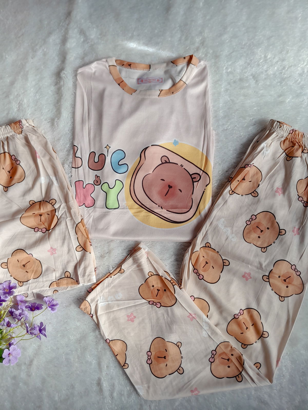 Hermosos conjuntos importados de 3 piezas,está compuesto por:remera manga corta + pantalón largo + shorts 🌸. -Material: algodón con poliéster -Talle: único(abarca hasta talle 44/46 aprox)