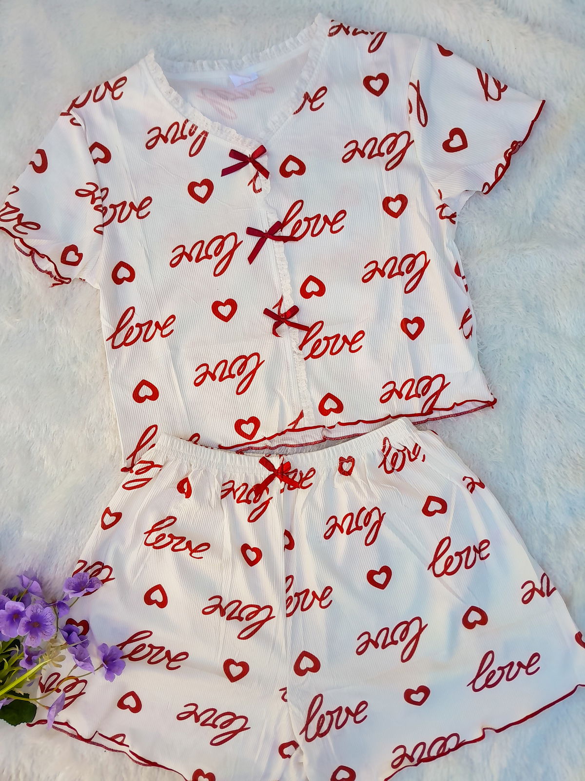Hermosos conjuntos importados de 2 piezas,está compuesto por:remera/top manga corta + shorts 🌸.Con detalle súper delicado de moñitos 🎀 en remera y shorts,además puntilla en cuello de remera.