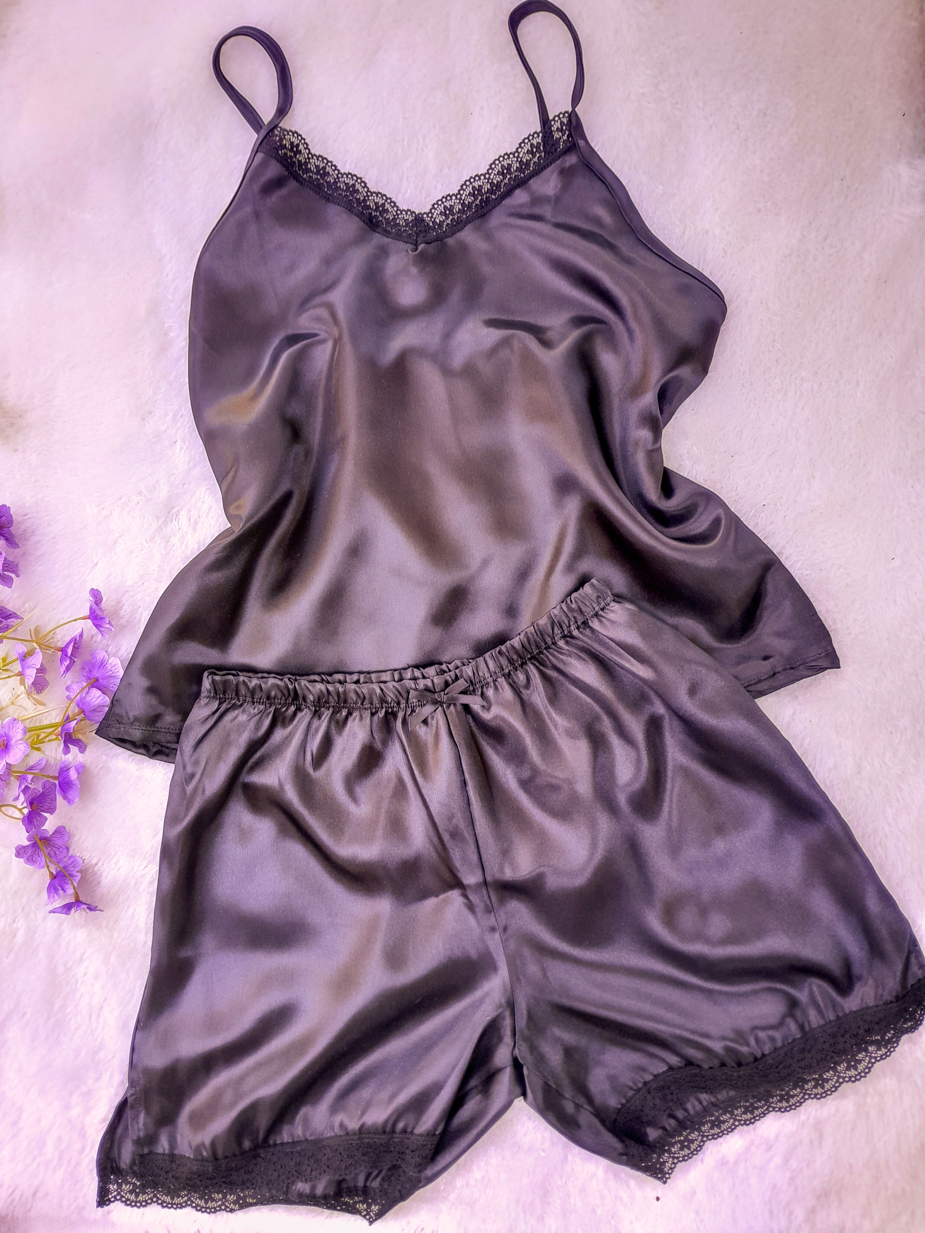 Con detalle super delicado de encaje en parte superior de musculosa y parte inferior de short.