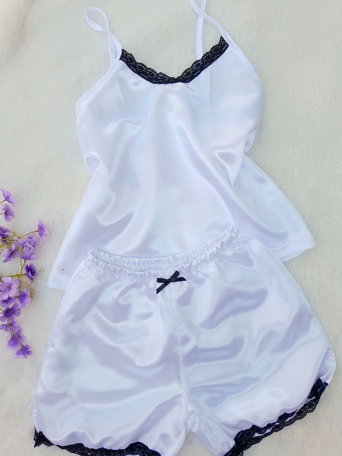 Con detalle super delicado de encaje en parte superior de musculosa y parte inferior de short